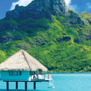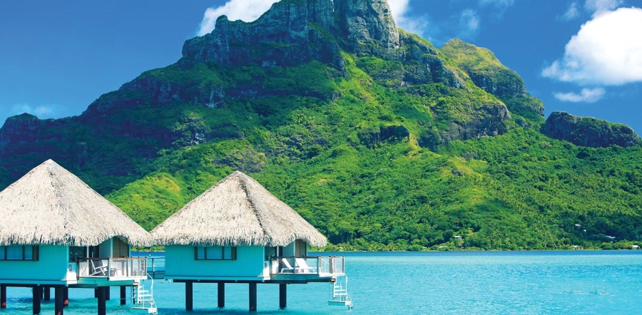 Bora Bora, Polynesia thuộc Pháp: Đảo lãng mạn với bãi biển đẹp, rừng núi xanh và khách sạn nổi trên nước.